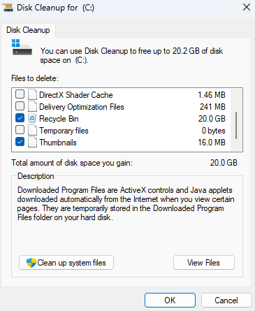A new window will open where you need to select the files to be deleted. We recommend you select all the possible items to free up as much disk space as possible. You can be sure that using this tool is safe and will not harm Windows. After selecting the files to delete, below, you can see how much storage space will be freed up after the procedure. Click ‘OK’ and confirm the deletion.
