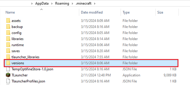 The saved worlds related to modpacks in TLauncher are located in a different directory, as each modpack needs its own folders with mods, resource packs, etc. To begin with, open the game folder in any convenient way and find the versions folder in it. It locates all the modpacks you have.
