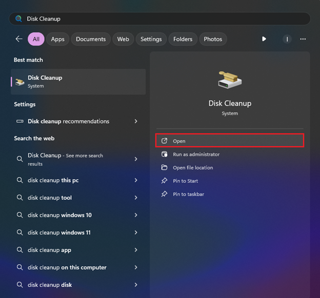 To launch the utility, open the Start menu by pressing the Win button or clicking on the respective icon on the taskbar. Type ‘Disk Cleanup’ and left-click on the application to open it. A special window will appear where you need to select a disk to clean. In this case, it must be ‘C:’ selected by default. Click ‘OK’ to continue the cleaning process.