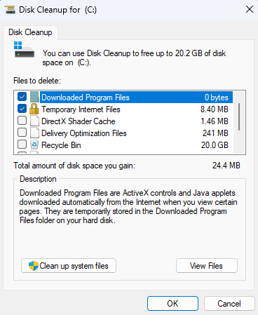 A new window will open where you need to select the files to be deleted. We recommend you select all the possible items to free up as much disk space as possible. You can be sure that using this tool is safe and will not harm Windows. After selecting the files to delete, below, you can see how much storage space will be freed up after the procedure. Click ‘OK’ and confirm the deletion.