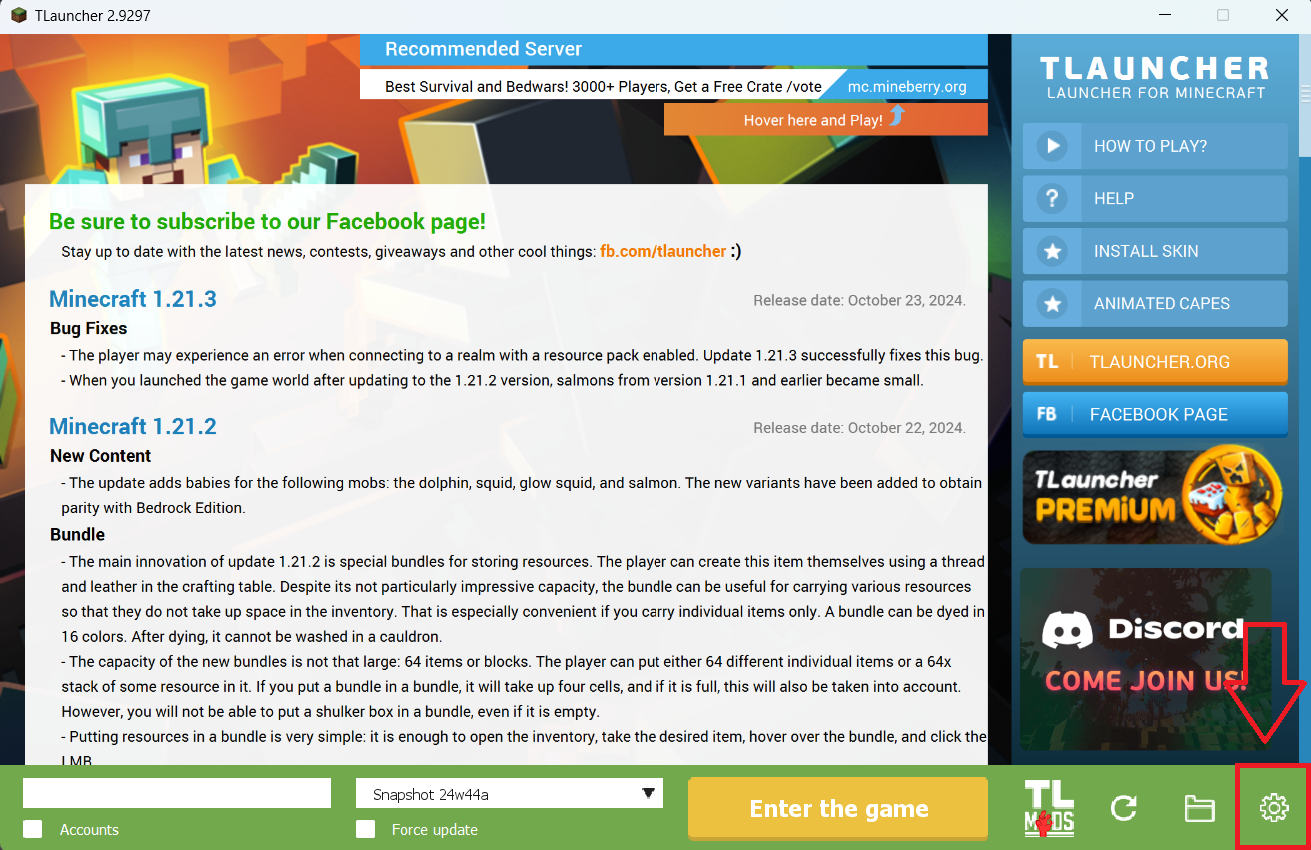 Step 1. Open TLauncher and go to the Settings tab by clicking the gear icon in the lower right corner.