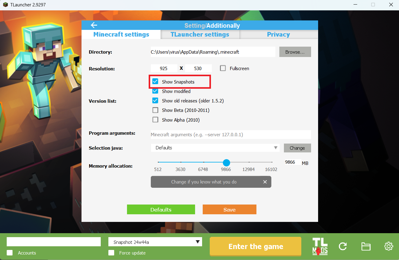 Step 3. On the main screen of TLauncher, open the version selection tab, select the desired snapshot, and click 'Install' or 'Launch the Game' if the snapshot is already installed.